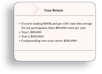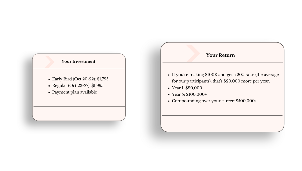You'll have proven strategies and frameworks to continue advocating for yourself. Plus, many participants negotiate raises, better benefits, or career clarity even without a promotion. The ROI isn't just about the title—it's about taking control.